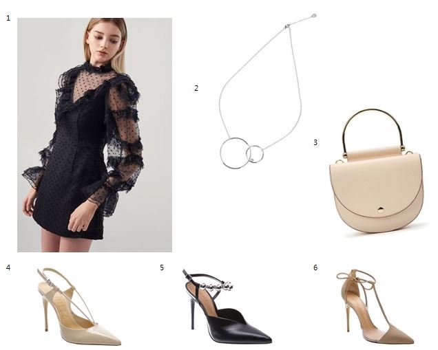 여성스러운 라인을 살려주는 스트랩 하이힐은 발목을 안정적으로 잡아주기 때문에 편안하면서도 페미닌한 무드 연출이 가능하다. 여기에 볼륨감 있는 소매와 허리 라인이 돋보이는 블랙 시스루 원피스 매치는 여성미를 강조하며 관능적이고 섹시한 여성의 매력을 뽐낼 수 있다. 또한 유니크한 매력이 돋보이는 라운드형 실버 목걸이와 금속 핸들이 돋보이는 토트백은 데일리 아이템으로도 활용할 수 있다.