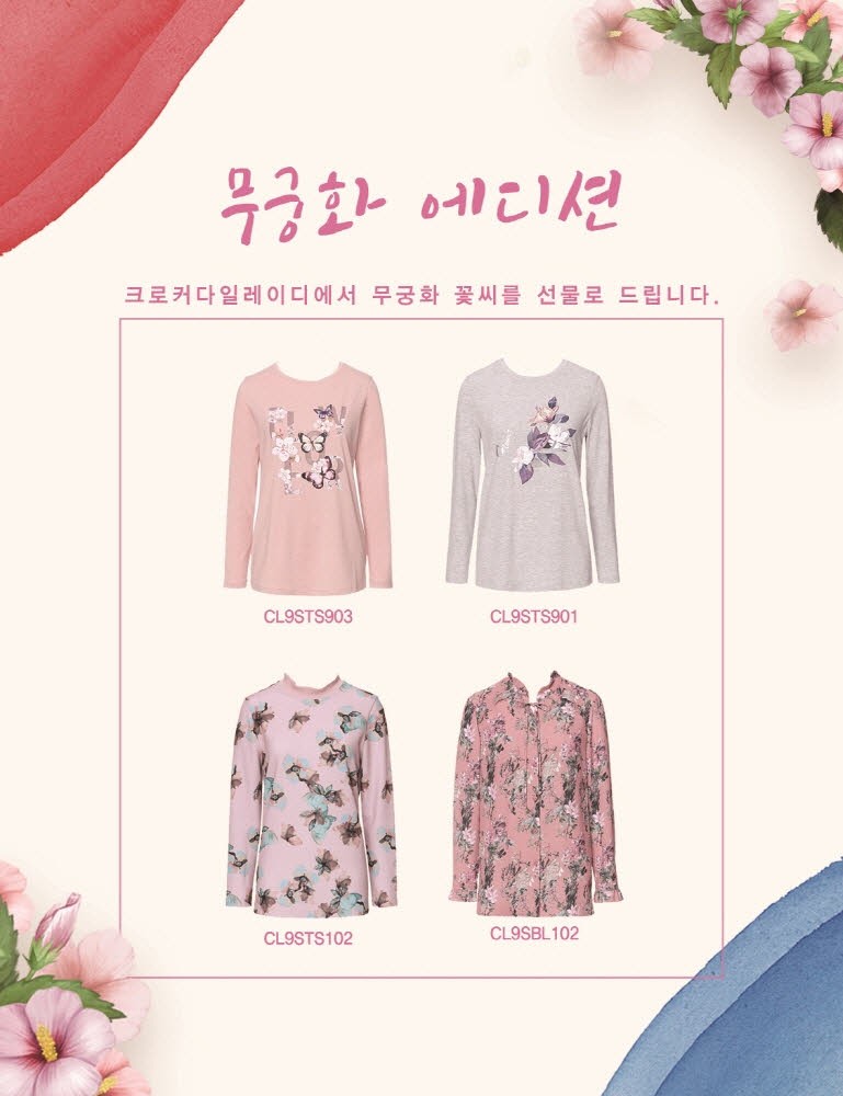 ‘크로커다일레이디’는 봄에 가장 활용도가 높은 블라우스 1종과 티셔츠 3종을 무궁화 에디션으로 선보였다. 대표 제품인 플로럴블라우스(CL9SBL102)은 신축성이 좋은 원단에 플라워 패턴을 프린트하고 셔링과 리본 디테일을 더한 로맨틱 페미닌룩이다. 몸에 달라붙지 않고 부드럽게 흐르는 실루엣으로 세련된 매력을 드러낼 수 있다.