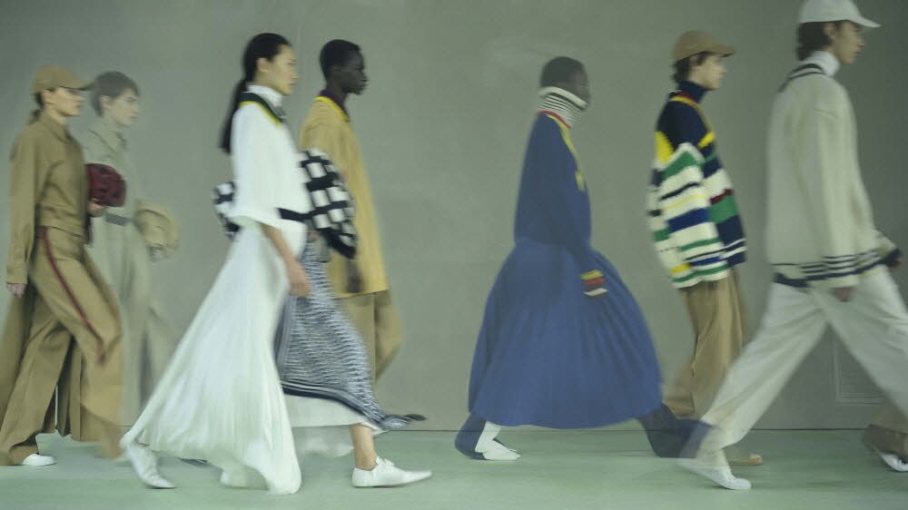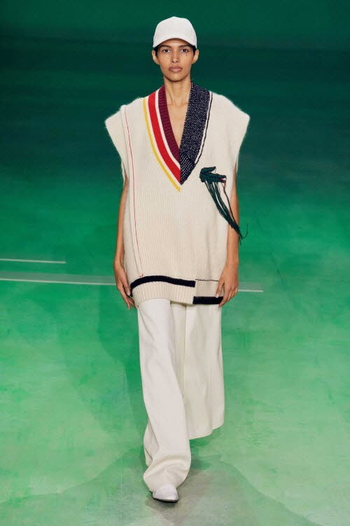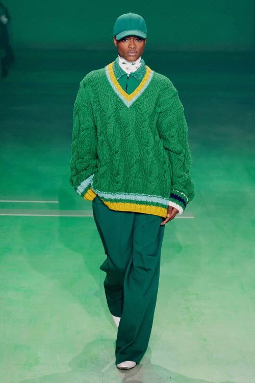 ‘라코스테’의 상징적인 컬러인 그린 라이트가 깔려진 테니스장 속에서 세 명의 스포츠 스타가 오마주 된 컬렉션들을 선보였다. 브랜드 창립자인 르네 라코스테, 그의 아내이자 골프 챔피언인 시몬 띠옹 드 라 숌, 르네와 함께 테니스계를 주름잡았던 전설의 여자 선수 수잔 렝글렌. 이들의 스타일과 실루엣을 현대적으로 재해석한 룩들이 런웨이를 오갔다.