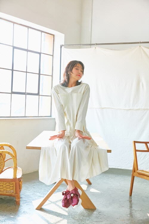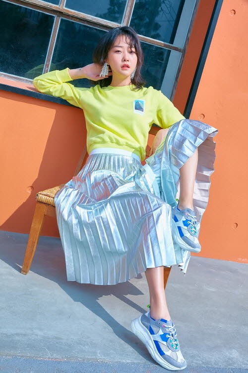 ‘질바이질스튜어트’ 슈즈가 공개한 화보 속 강승현은 코튼 소재의 화이트 원피스에 와인색 슬립온을 매치해 포인트를 주었으며 노랑색 맨투맨과 은색 플리츠 치마에 파랑색 어글리 스니커즈를 매치해 자연스러우면서도 화사한 봄 패션을 완성했다.