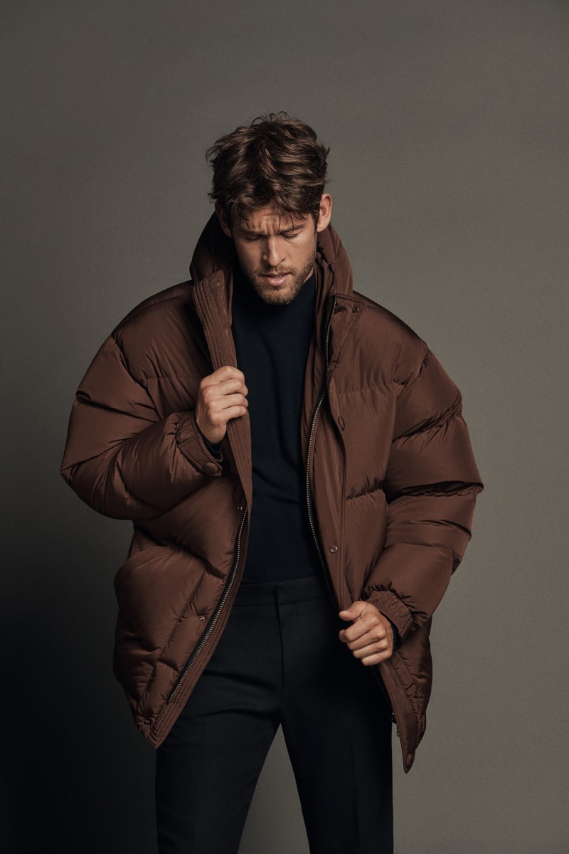 흙빛이 나는 브라운 컬러의 숏 푸퍼로 셋업 슈트와 조합은 물론 캐주얼 착장에도 잘