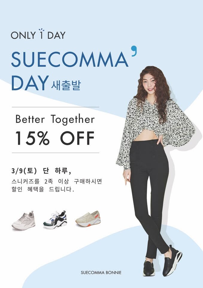 이번 3월 9일 슈콤마데이는 ‘둘이 함께 새 출발! Better Together’을 주제로 신학기, 화이트데이 등을 맞이하여 ‘슈콤마보니’ 스니커즈를 2족 이상 구매하면 15% 할인 혜택을 제공한다. 슈콤마데이 프로모션은 공식 온라인몰인 코오롱몰(www.kolonmall.com)과 오프라인 매장(면세점, 아울렛 제외)에서 진행되며 당일 구매에만 적용된다.