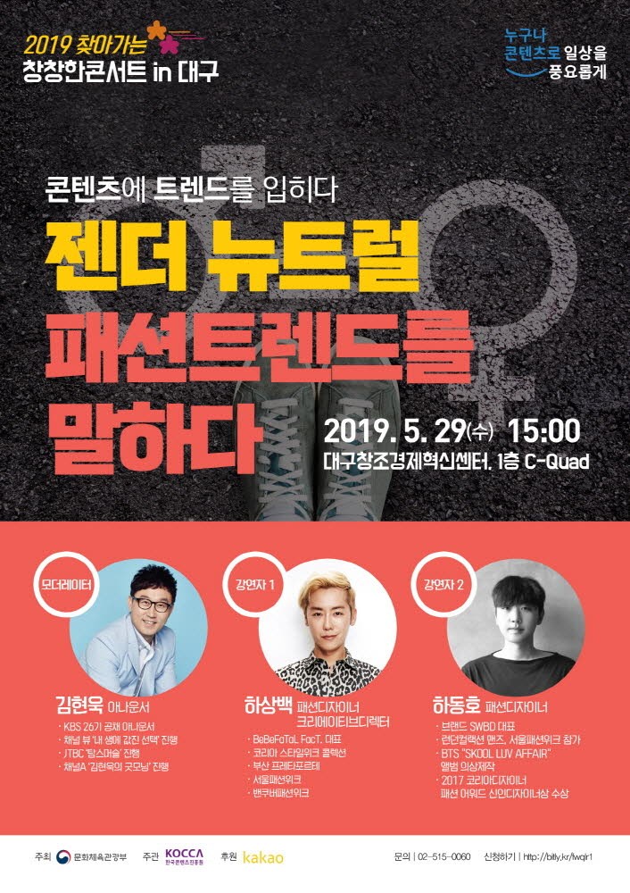 ‘창창한 콘서트 in 대구’에서는 <젠더 뉴트럴, 패션 트렌드를 말하다>를 주제로 최근 화두가 되고 있는 성 중립과 패션에 대해 심도 있고 흥미 있는 이야기가 펼쳐진다.