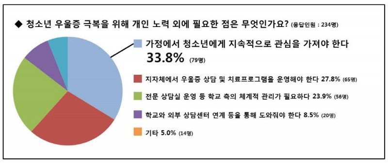 마지막으로 청소년 우울증 극복을 위해 개인적 노력 외에 필요한 점에 대한 질문에는 ‘가정에서 청소년에게 지속적으로 관심을 가져야 한다(33.8%)’, 지자체에서 청소년 우울증 상담 및 치료 프로그램을 운영해야 한다(27.8%), 전문 상담실 운영 등 학교 측의 체계적 관리가 필요하다(23.9%) 등의 답변이 고르게 선택됐다.