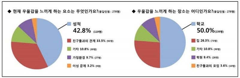 이번 설문 결과에 따르면 응답 학생들이 우울감을 느끼는 대표적인 요소로 성적(42.8%)과 친구들과의 관계(33.5%)라고 답했다. 응답자들이 속해 있는 환경에서 우울감을 느끼게 하는 장소로는 하루의 대부분의 시간을 차지하는 ‘학교’가 50%로 가장 많은 선택을 받았으며 26.3%는 ‘집’이라고 응답했다.
