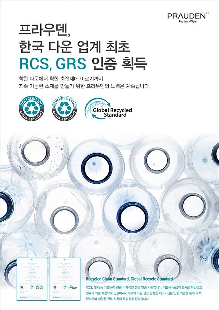프리미엄 다운 소재 브랜드 프라우덴(PRAUDEN)’이 국내 다운업계 최초로 친환경 국제 인증인 RCS(Recycled Claim Standard)GRS(Global Recycled Standard)를 동반 획득했다.