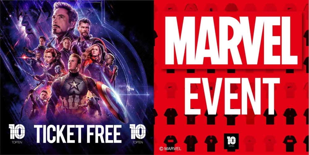 탑텐은 소비자들의 뜨거운 반응에 보답하는 의미로 오는 19일 탑텐 강남역점 매장에서 어벤져스:엔드게임관람권을 증정하는 깜짝 이벤트를 진행한다. 19일 오후 7시부터 진행되는 이번 이벤트는 매장 내 연출되어 있는 마블 히어로스 제품 사진을 찍어 필수 해시태그와 함께 개인 SNS에 업로드 하고 인증하면 선착순 200명에게 영화 관람권을 증정한다. 또한 선물 받은 관람권을 필수 해시태그와 함께 개인 SNS에 올리면 추후 추첨을 통해 탑텐 마블 히어로스콜라보 티셔츠를 선물로 증정한다.
