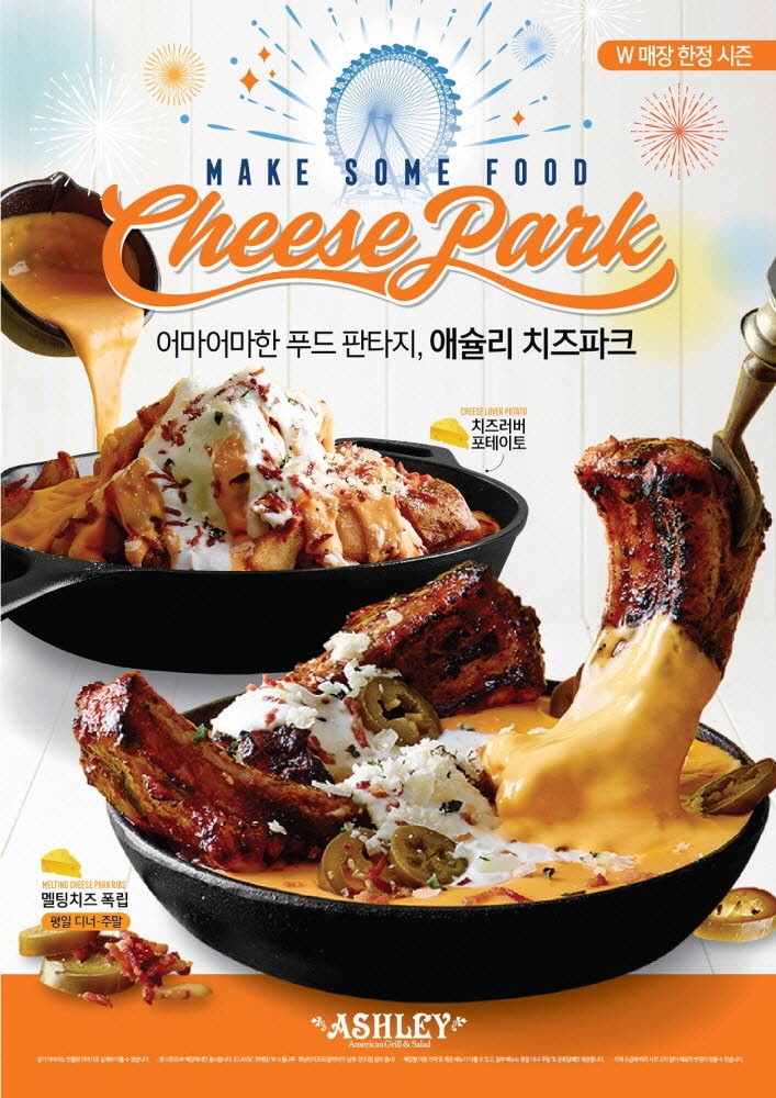 ‘애슐리W’의 치즈 파크 13종 신메뉴는 치즈 퐁듀, 치즈 폭립, 치즈볼, 필리 치즈 스테이크 버거, 페퍼로니 맥 앤 치즈, 치즈 러버 포테이토 등이다. 추가로 회전목마 케이크, 슈타워 등 달콤한 디저트 류도 폭넓게 제공할 예정이다.