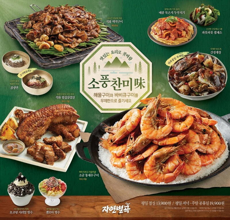 ‘자연별곡’은 소풍찬미味로 메뉴 개편 콘셉트를 정하고 나들이, 캠핑을 하며 먹기 좋은 해물과 바비큐 요리 메뉴 13종을 선보인다.