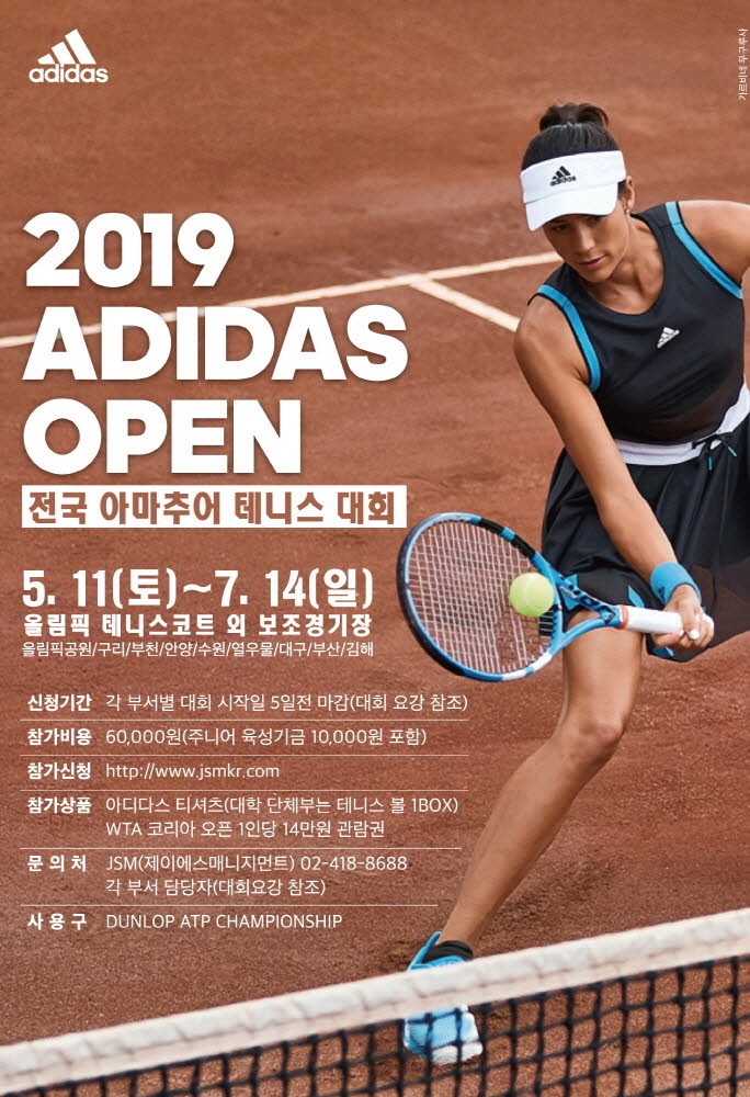 이번 2019 ‘아디다스’ 오픈 전국 아마추어 테니스 대회는 결선 경기가 진행되는 오는 7월 14일까지 올림픽공원 테니스코트를 비롯한 전국 총 9개 지역에서 펼쳐지며 참가를 원하는 사람은 JSM(제이에스매니지먼트) 공식 홈페이지를 통해 신청할 수 있다.