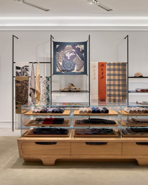 새롭게 단장한 ‘버버리’ 서울 플래그십 스토어는 ‘버버리’의 상징적인 체크 패턴이 적용된 가구와 기마상 로고가 새겨진 집기로 인테리어가 구성되어 브랜드의 유산을 공간에 녹여냈다. 또한 영국의 저명한 예술가 헨리 무어와 바버라 헵워스의 작품에서 영감을 받은 가구들이 함께 배치되어, 버버리가 영국 예술계와 이어온 깊은 관계를 보여준다.