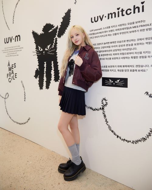 아이브 리즈는 러브밋치 캐릭터가 포인트인 니트 베스트에 플리츠 스커트를 매치한 후 캐주얼한 무드의 스타디움 점퍼를 착용해 트렌디하면서도 러블리한 매력을 과시 했으며 박제니는가을 시즌 데일리하게 입기 좋은 러브밋치 스웻셔츠와 코듀로이 카라 포인트의 미디 자켓을 함께 착용해 다가오는 가을 시즌 분위기를 느낄 수 있는 룩을 선보였다.