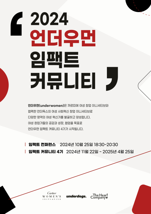 ‘까르띠에 여성 창업 이니셔티브’와 협력을 통해 국내외 혁신 창업가를 발굴하고 육성하며 창업 전반을 지원하는 창업 교육 기업인 언더독스가 ‘언더우먼 임팩트 커뮤니티 4기’를 10월 16일부터 11월 6일까지 모집한다.
