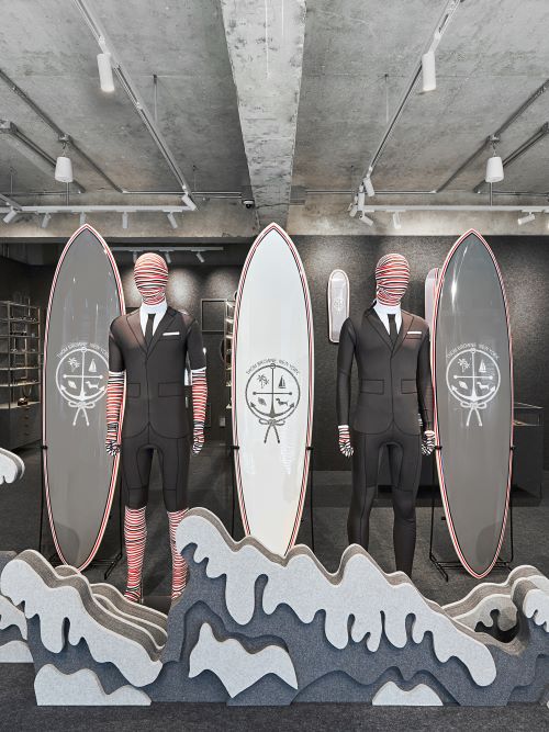 팝업스토어 안팎에 ‘톰 브라운’의 비전을 투영한 회색 플란넬 소재로 감쌌고 장인정신과 테일러링, 예술의 세계를 3개층으로 차별화되게 구성했다.