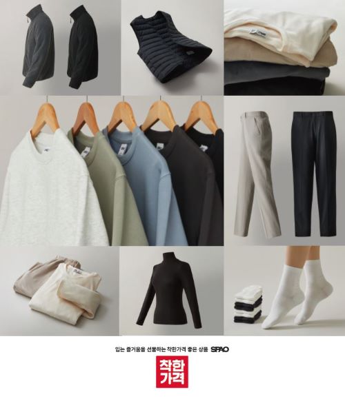 ‘스파오’ 착한가격 라인업의 대표 상품으로는 ▲베이직 플리스 집업(19,900원) ▲와이드 플리스 팬츠(19,900원) ▲라이트 패쪼(19,900원) ▲WARM 긴팔티(9,900원) ▲웜테크(9,900원) 등이 있다.