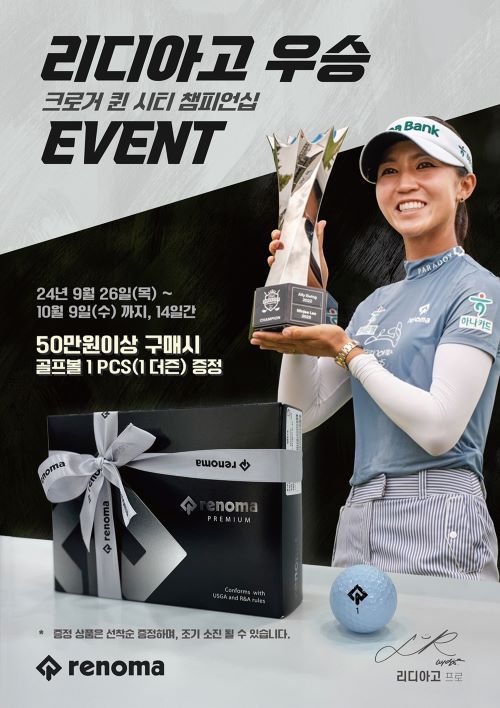 ‘레노마골프’는 리디아고의 연이은 우승 소식을 기념해 다양한 프로모션 이벤트를 마련했다. 10월 9일까지 오프라인 매장에서 50만원 이상 구매하는 고객에게는 골프볼 1PCS를 증정한다.