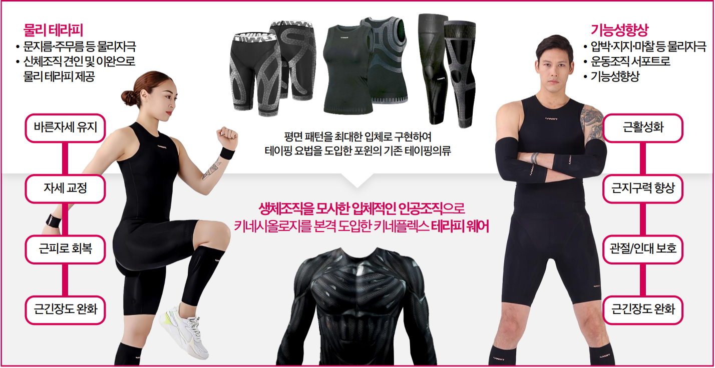 포윈은 스포츠 테이핑과 키네시올로지 테이핑 논리를 적용한 기능성 의류인 테이핑의류 제품을 개발하여 시장을 선도하고 있으며 이러한 기술을 기반으로 신체 기능 개선과 보호 및 통증완화, 자세교정 등의 치료를 목적으로 한 물리치료학 논리를 적용한 테라피 웨어를 개발하고 있다. 향후 글로벌 의류 산업에서도 많은 관심을 가지고 있는 바이오닉 의류 개발도 준비하고 있다.