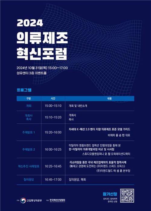한국패션산업협회(회장 성래은)가 산업통상자원부의 지원으로 오는 10월 31일 섬유센터 3층 이벤트홀에서 ‘2024 의류제조 혁신포럼’을 개최한다.