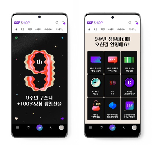 특히 올해는 론칭 9주년을 맞아 이달 23일까지 9개의 다양한 혜택을 담은 프로모션을 마련했다. △나의 가입일자/첫구매 상품/나의리뷰 작성수 등 9주년 추억만 훑어봐도 제공하는 ‘9만원 쿠폰패키지’, △9주년 추억 내용을 캡쳐해 하단에 포토 댓글 혹은 텍스트 댓글로 남기면 9900원 퍼플코인 지급하는 ‘9주년 자랑 댓글’, △최대 20% 쿠폰, 5만 퍼플코인, 메종키츠네 카디건 중 1개의 혜택을 매일 주는 ‘데일리 랜덤 생일선물’, △9만원 이상 구매 시 5만 퍼플코인 페이백 받을 수 있는 ‘9만원 페이백 응모’, △토스페이로 15만원 이상 결제 시, 7천원 할인해주는 ‘결제 혜택’, △SSF샵 애플리케이션을 통해 응모하면 추첨을 통해 럭셔리 브랜드 상품을 무료로 주는 ‘생일 기념 래플’, △매일 오전 9시~오후 9시 상품 카테고리별 최대 60% 할인하는 ‘9-9 타임딜’, △9000원 이하 상품부터 29만 9000원 이하 상품까지 저렴한 가격으로 구매할 수 있는 ‘99특가’, △매일 신규 가입자 선착순 99명에게 1만 퍼플코인 제공하는 ‘첫구매 코인 이벤트’ 등이다.