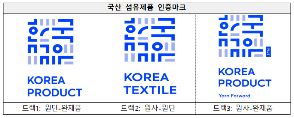 인증종류는 총 3개의 트랙으로 구성, 트랙1은 원단부터 완제품까지, 트랙2는 원사부터 원단까지, 그리고 트랙3은 원사부터 완제품까지 국내산임을 말한다.