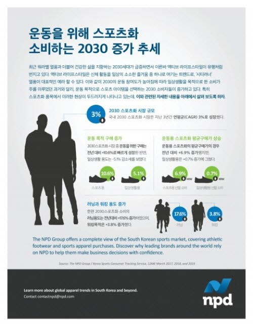 미국계 시장조사회사 더엔피디그룹(The NPD Group)이 국내 2030세대의 스포츠화 성장 동향 보고서를 발표했는데 국내 2030세대의 스포츠화 시장이 지난 3년간 연평균 3% 꾸준히 증가했다고 발표했다.