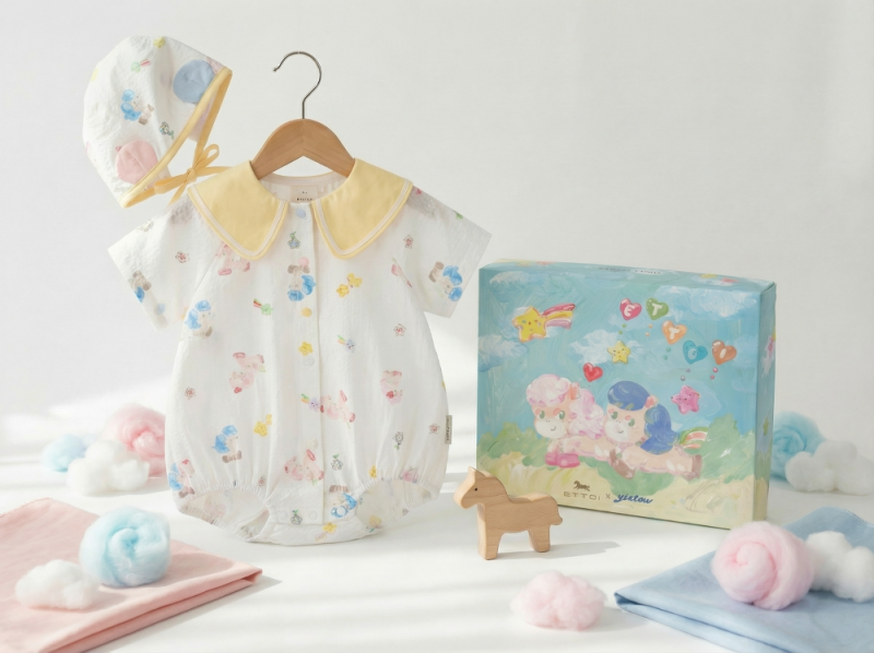 이슬로 작가 특유의 천진난만한 그림과 색채로 표현한 이번 협업 제품에서 이슬로 스타일의 ‘에띠’ 아트웍을 다양한 소재로 활용한 여름옷과 출산용품을 만나볼 수 있다. 총 13가지 스타일로 ▲에띠블루머바디수트SET ▲에띠우주복SET ▲에띠상하 ▲에띠슬로바디수트SET ▲에띠슬로블랭킷 등 신생아부터 2세까지 입을 수 있는 다양한 의류와 손싸개, 블랭킷, 베개와 같은 출산용품으로 상품을 구성했다.