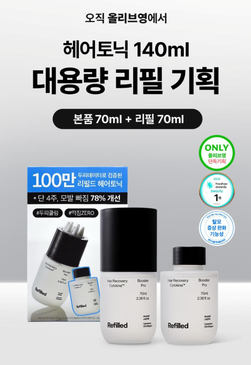 이번 기획전에 선보이는 제품은 ‘리필드’를 대표하는 ‘부스터 프로’ 기획세트다. 부스터 프로는 30년 연구 끝에 개발된 독자 특허 성분 ‘cADPR(사이클릭 ADP-리보스)’ 기반의 사이토카인 케어 솔루션으로 탈모 증상 완화에 도움을 주는 헤어토닉이다. 본품과 리필로 구성된 해당 세트는 할인가인 2만9900원에 판매되며 추가 쿠폰까지 더해 가격 경쟁력을 높였다. 리필을 포함해 용기를 재활용할 수 있게 함으로써 경제성뿐 아니라 환경적 가치까지 고려한 지속 가능한 두피 케어 경험을 제공한다.