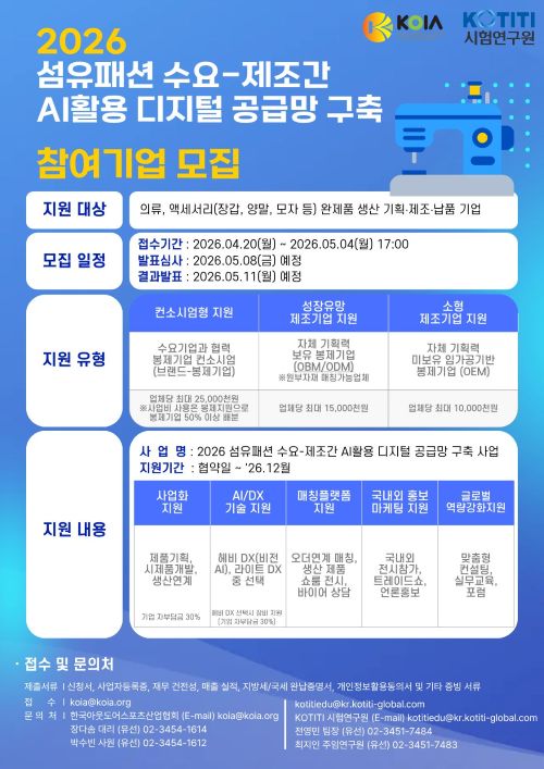 이번 사업은 국내 섬유패션 산업의 디지털 전환과 글로벌 경쟁력 강화를 도모하기 위해 산업부 지원을 받아 한국아웃도어스포츠산업협회와 KOTITI시험연구원이 오는 5월 4일까지 사업 참여 기업을 모집한다.