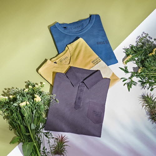 천연 염색 특유의 컬러가 돋보이는 #GUESSECO 티셔츠는 옐로우, 블루, 핑크, 그레이, 브라운 총 5가지 컬러의 라운드넥 티셔츠와 포켓 디테일의 브이넥 티셔츠, PK티셔츠로 구성, 다양한 스타일링 연출이 가능해 데일리 아이템으로 활용할 수 있다.