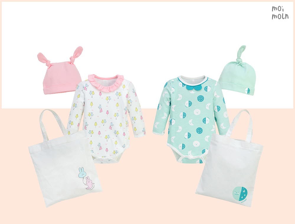 벌룬양면선물세트는 풍선을 든 토끼를 옷 곳곳에 프린팅했으며 프릴 목 장식으로 귀여움을 더한다. 두 개의 귀가 부착된 핑크 모자도 세트로 연출하기 제격이다. 모이몰른의 쁘띠 기프트 세트는 70, 80 두 가지 사이즈로 만나볼 수 있으며 4만원의 합리적인 가격대로 구성됐다.
