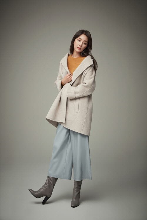 코트는 프리미엄 소재인 메리노울 100% 소재로 제작되어 뛰어난 보온성은 물론 부드러운 촉감과 은은한 광택이 특징이다. 전체적으로 여유 있는 넉넉한 실루엣으로 겨울철에는 경량 다운이나 니트, 가디건 등과 함께 레이어링해 보온성을 높이고 간절기에는 단독 아우터로 활용할 수 있어 실용도가 높다.