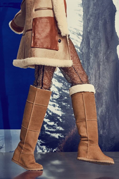 이번 시즌 가장 눈에 띄는 디자인은 무릎까지 높이 올라오는 롱 부츠 클래식 팜므 오버 더 니다. 어그의 상징인 샌드 색상 스웨이드 외관에 내구성이 좋은 웨지힐 스타일로 제작됐다. 부츠 상단을 접으면 안감의 양털 부분이 드러나 새로운 스타일을 연출할 수 있으며 전체적으로 적용된 스티치 디테일이 멋스럽다.