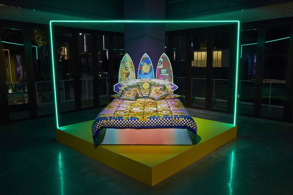 이번 전시를 위해 사샤 비코프는 ‘베르사체’의 아이코닉한 룩에서 영감을 받은 가구를 제작했으며 이 유니크한 가구 작품들은 ‘베르사체’ 착장들과 함께 전시되었다. 1994 S/S 컬렉션에서 영감을 받아 제작된 침대는 서프 보드를 사용하여 만들어졌으며 비비드한 색상과 ‘베르사체’의 아이코닉한 프린트로 재구성되었다. 1993 S/S 컬렉션은 태양, 달, 별이 프린트 되어있는 골드 톤의 우드 커피 테이블로 재탄생되었다.