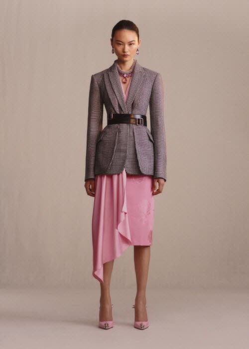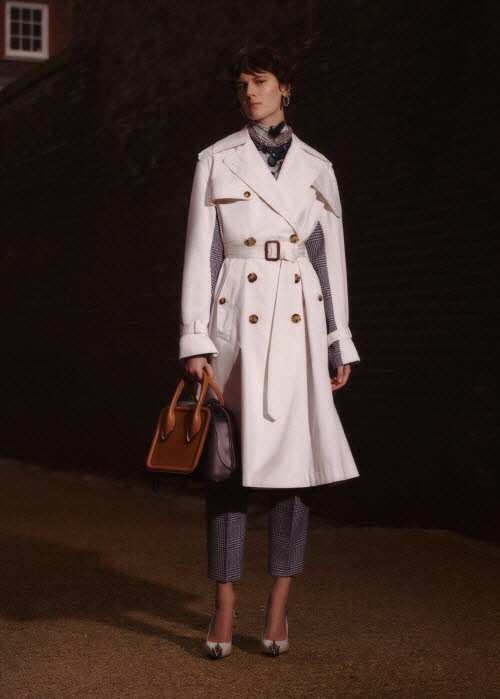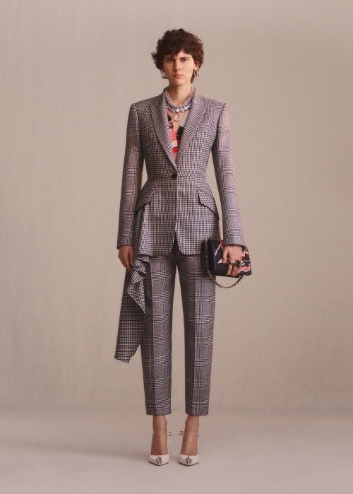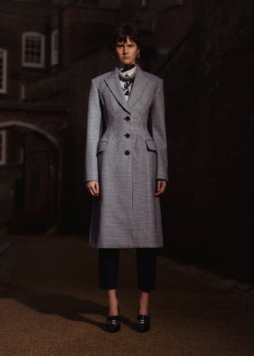 남성 컬렉션에서 받은 영향으로 영국의 유산인 브리티시 패브릭으로 제작된 코트를 재해석한 코르셋 실루엣 재킷에 드레이핑 스커트 & 팬츠를 함께 매치한 룩에서는 강인하면서도 우아한 여성상을 느낄 수 있다.