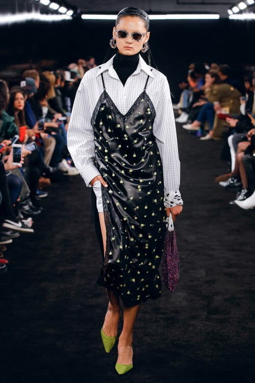 알렉산더왕은 올 가을 셔츠와 원피스가 레이어드 된 롱 슬립 드레스를 선보였다. 체크 패턴의 화이트 면 셔츠에 광택감 있는 롱 블랙 드레스가 겹쳐진 형태로 여유로우면서 도발적인 매력을 선사한다.