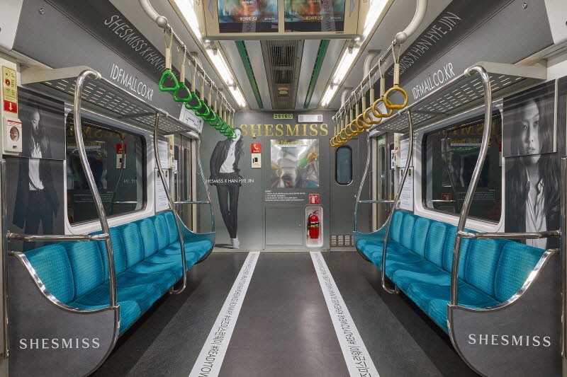 ‘쉬즈미스’ 런웨이 지하철 랩핑 광고는 객실 내 천장과 출입구를 제외한 모든 면을 탑 모델 겸 방송인 한혜진과 함께한 쉬즈미스 올 FW 광고로 랩핑했다.