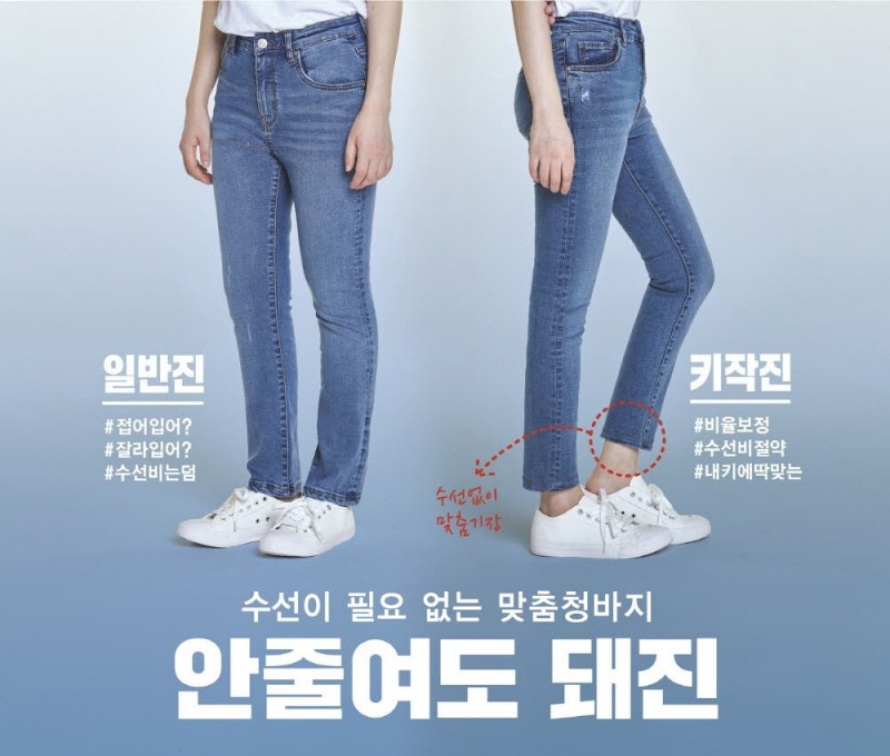 뿐만 아니라 동양인 체형에 최적화 된 맞춤형 기장인 안 줄여도 돼jean도 선보였다. 안 줄여도 돼jean은 기존에 청바지를 항상 수선해서 줄여 입어야 했던 고객을 위한 상품으로 발목까지 딱 맞는 기장으로 출시됐다.