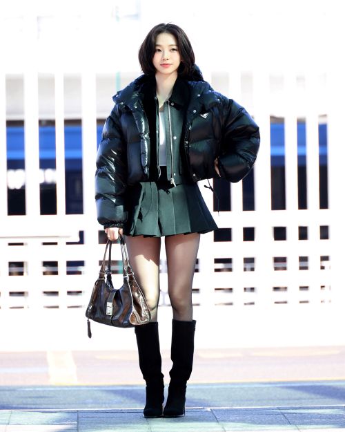 스포티한 디자인에 테크웨어 요소가 가미된 리나일론 컨버터블 크롭 다운 재킷과 모던한 무드의 블루종 재킷을 레이어드해 연출했다. 여기에 가죽 스트랩 디테일이 돋보이는 플리츠 미니스커트를 매치해 사랑스러우면서도 세련된 분위기를 완성했으며 스웨이드 니하이 부츠와 프라다의 아이코닉한 사다리꼴 실루엣의 토트백으로 룩에 포인트를 주었다.