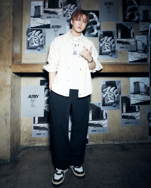 창빈은 오트리 화이트 티셔츠에 크림 컬러의 헤링본 셔츠를 레이어드하고 블랙 팬츠로 균형감 있는 스타일링을 완성했다. 여기에 협업 컬렉션의 화이트 블랙 투톤 스니커즈를 매치해 감각적인 포인트를 더했다.