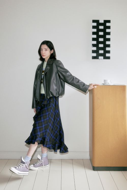 박지현은 체크 패턴 오간자 소재의 블라우스와 클래식한 브라운 자켓으로 가을의 정석 코디를 완성하는가 하면 부드럽게 떨어지는 페이크 레더 자켓과 언발란스한 기장과 프릴 디테일이 돋보이는 블루 체크 스커트를 착용해 캐주얼과 페미닌 사이를 넘나드는 스타일을 완벽 소화했다.