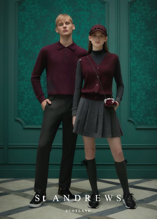 버건디와 그레이의 클래식한 컬러 팔레트는 ‘세인트앤드류스’가 지향하는 우아한 골프웨어의 정수를 담아내며 한층 깊어진 가을 무드로 커플 라운드를 특별하게 완성했다.