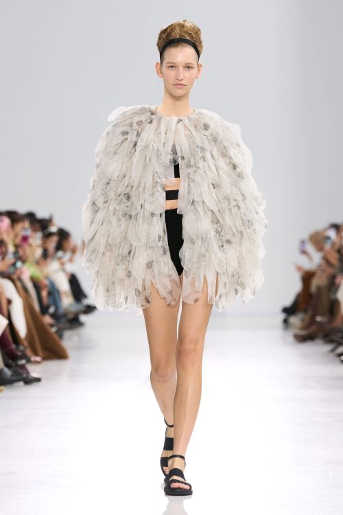 트렌치 코트는 어깨 위에 섬세하게 접힌 왕관 모티브로 장식되어 황금빛 아칸서스 잎이나 화려한 깃털을 연상시키고 풍성한 거즈 소재 장식은 펜슬 스커트의 힙 라인을 따라 자연스러운 실루엣을 강조한다.