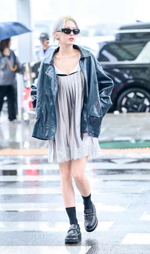 이날 전소미는 은은한 그레이 컬러의 레이스 장식이 밑단에 들어간 미니 플리츠 원피스를 착용해 사랑스러우면서도 페미닌한 무드를 자아냈고 오버핏 블랙 레더 자켓을 걸쳐 시크한 공항패션을 완벽 소화했다.