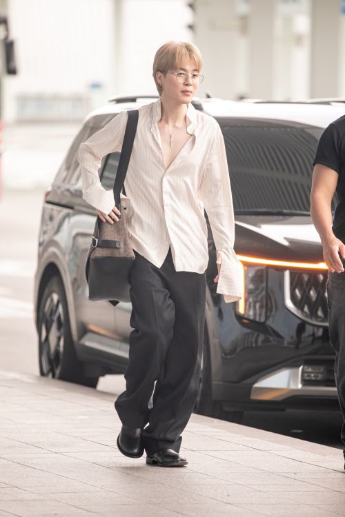 지민의 공항패션을 완성시켜 준 룩은 ‘디올’ 제품으로 알려졌다. Dior Summer 26 컬렉션 핑크 스트라이프 트윌 셔츠로 컬러감에 포인트를 주면서 블랙 첼시 부츠와 브라운 울 메신저 백을 함께 매치해 클래식함을 더해주었다.