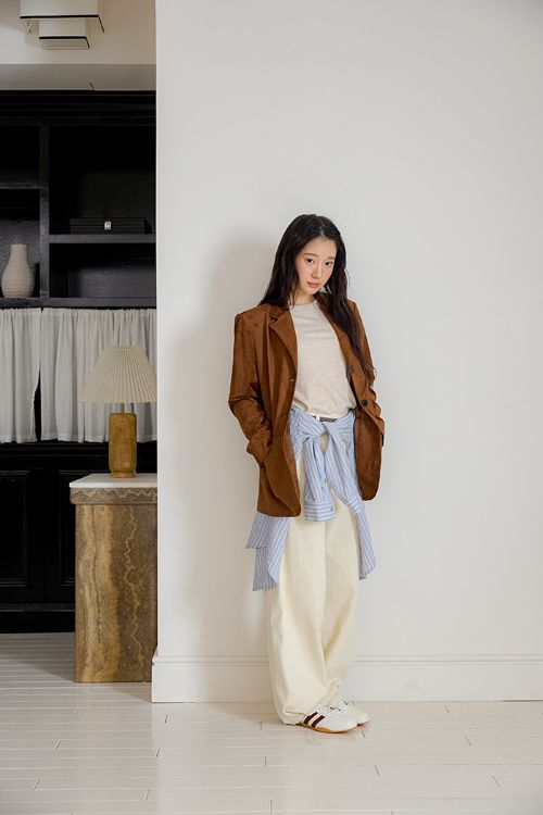부드럽고 유연한 스웨이드 소재의 ‘싱글 쓰리 버튼 스웨이드 자켓’은 클래식한 테일러드 카라와 싱글 버튼으로 포멀한 룩부터 캐주얼한 룩까지 활용도가 높다.