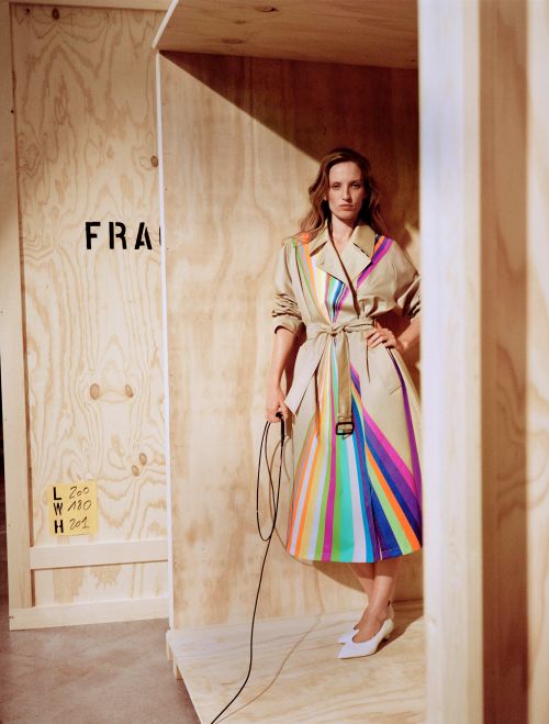 이탈리아 출신 아티스트 파올라 피비는 일상의 오브제를 작품 속에 도입해 그 특성을 변형하고 재해석함으로써 관객에게 현실을 새롭게 바라보는 시선을 제안한다. 현재 풍요로운 자연을 간직한 하와이에 거주하는 그녀는 섬을 가득 채우는 찬란한 빛과 식생을 물들이는 강렬한 색채, 그리고 거의 매일 하와이 하늘을 수놓는 쌍무지개에서 영감을 받아 이를 자신의 디자인에 담아냈다. 이 자연의 경이로움은 트렌치코트 앞뒤로 흘러내리는 다채로운 수직 스트라이프를 통해 구현되었으며 허리를 따라 좁아지는 모래시계 실루엣으로 완성되었다.