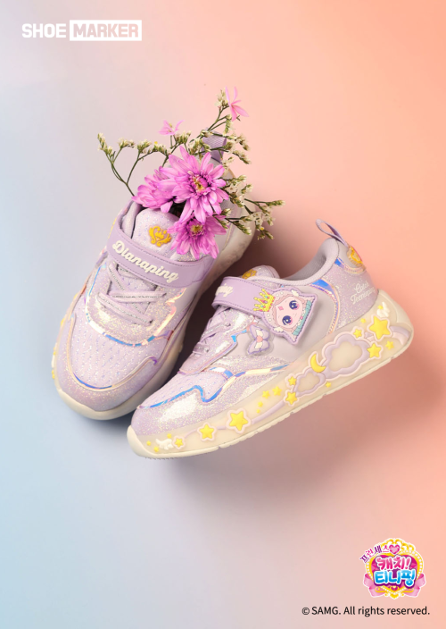 발등 스트랩에는 각 티니핑 캐릭터 장식과 영문 네임 프린팅을 적용해 콜라보 컨셉을 강조했으며 토와 힐 부분에는 캐릭터별 심볼 장식을 더해 디테일 완성도를 높였다. 슈즈 전체를 감싸는 스트링 구조를 적용해 안정적인 착화감을 제공하며, 데일리 슈즈로 활용도가 높다.