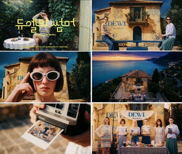 ‘듀엘의 썸머’는 가장 듀엘스러운 여름의 한 순간을 시각화했다. 특히 이번 컬렉션의 룩북 이미지 역시 100% AI 기술로 제작되어 눈길을 끈다. 실제 남부 프랑스에서 촬영한 듯한 자연스러운 장면 속에 현실보다 더 현실 같은 찰나의 여름을 완벽하게 담아냈다. 리조트 컬렉션을 착용한 6명의 주인공이 실재하지 않는 가상의 마을에 모여 예상치 못한 일탈과 위트 있는 행동을 이어가는 무드를 미학적으로 풀어냈다.