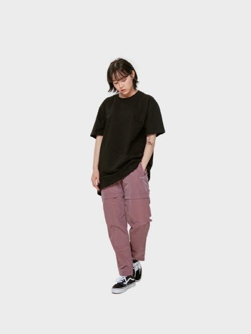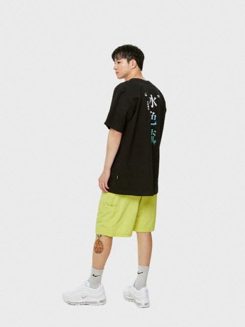 앞판은 심플한 블랙 무지 티셔츠로 부담스럽지 않게 포인트 주기 좋다. 여기에 네온 컬러의 숏 팬츠를 매치하면 청량감이 느껴지는 스타일리시한 여름 데일리룩을 완성할 수 있다.