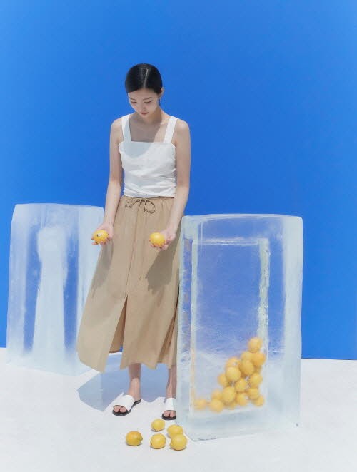 깨끗한 무드의 리넨 혼방 랩 원피스, 은은한 광택감이 고급스러운 소재를 적용한 비대칭 기장의 슬리브리스 블라우스/스커트 셋업, 캐주얼한 밴딩 와이드/쇼트 팬츠 등을 함께 선보였다.